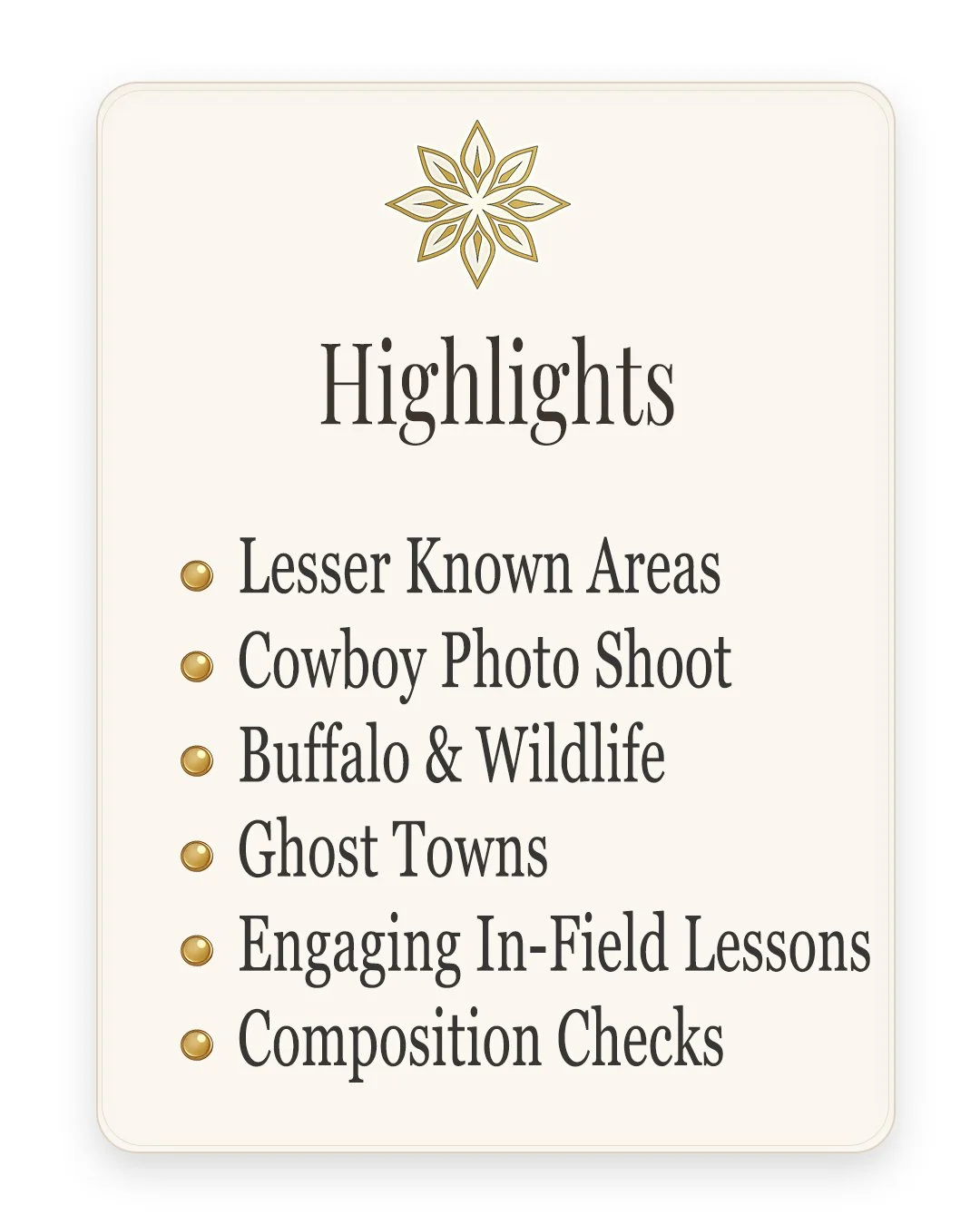 All locations and times visited will be determined by the conditions given. The itinerary below is provided to give an idea of the flow of each day. Times and locations may vary. All elements are watched closely for the best photographic and learning experience. During our first day we will cover camera settings, composition and guidelines. This time in the field will be the foundation for the rest of our time together.